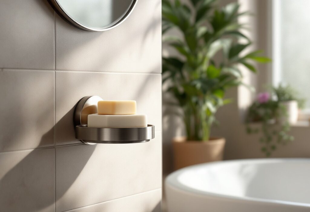 - Adhésif : Parfait pour installer un porte-savon mural sans perçage. C’est une solution rapide et souvent très résistante lorsque appliquée sur des surfaces lisses. Vérifiez toujours la capacité portante de l’adhésif pour éviter de mauvaises surprises.